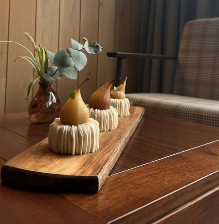 Beneath a light pear mousse lie a crisp streusel biscuit, a quince and pear confit enhanced with Magao berries, and a spiced poached pear.